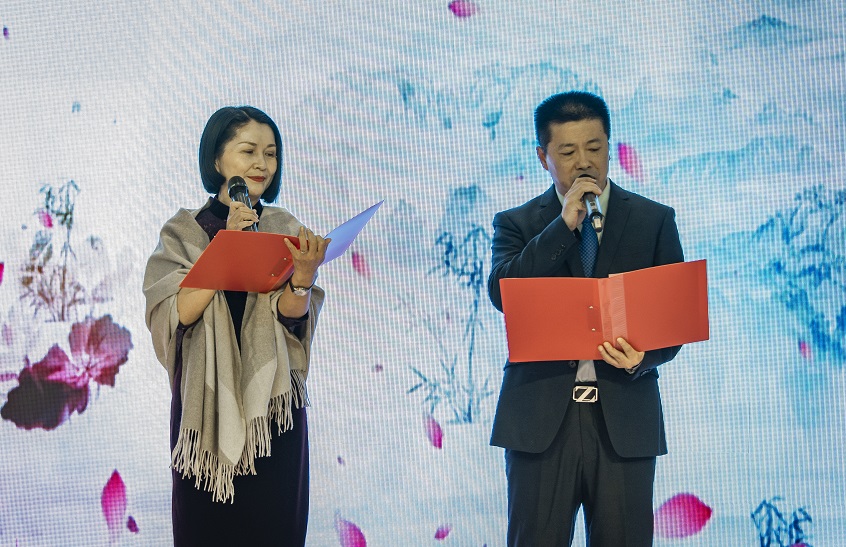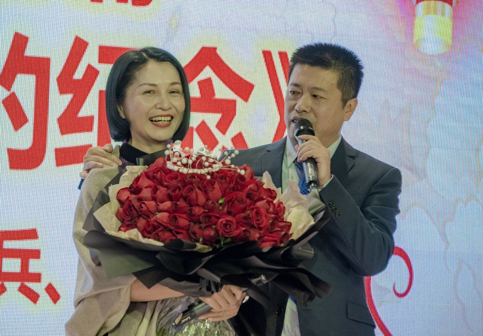 張老師、譚教授的配樂詩朗誦《四月的紀念》,給人們描繪了一對戀人在浪漫的四月相遇、相識到相知、相戀的心路歷程,男聲深沉渾厚、女聲輕盈委婉,極好地詮釋了詩歌的主題。一闋結(jié)束,張老師用單臂把愛妻擁入懷中,深情地說:今年是他和夫人結(jié)婚30周年的紀念日,特別感謝妻子30年如一日的愛戀、支持、幫助。這時他們的愛女笑盈盈地走上舞臺,把一大捧紅玫瑰獻給了媽媽。張老師在年會中插入這個溫馨浪漫的環(huán)節(jié),事先沒有告訴譚教授,他是想給譚教授一個驚喜。當我們現(xiàn)場看到譚教授接過鮮花時的燦爛笑容時,我深信譚教授是接受了這份愛的驚喜的。人們常說“一個成功男人背后一定有一個偉大的女人”,其實,在九江杰博逐步發(fā)展壯大的道路上,譚教授并不是站在背后的女人,而是始終和丈夫并肩站在一起的人生伴侶、事業(yè)同道!九江杰博能取得今天的成就,應(yīng)是張老師、譚教授風雨同舟、攜手共進的結(jié)果。大家用掌聲、笑聲、歡呼聲祝福這一對神仙伉儷一輩子恩愛幸福,年會出現(xiàn)了第二次高潮。