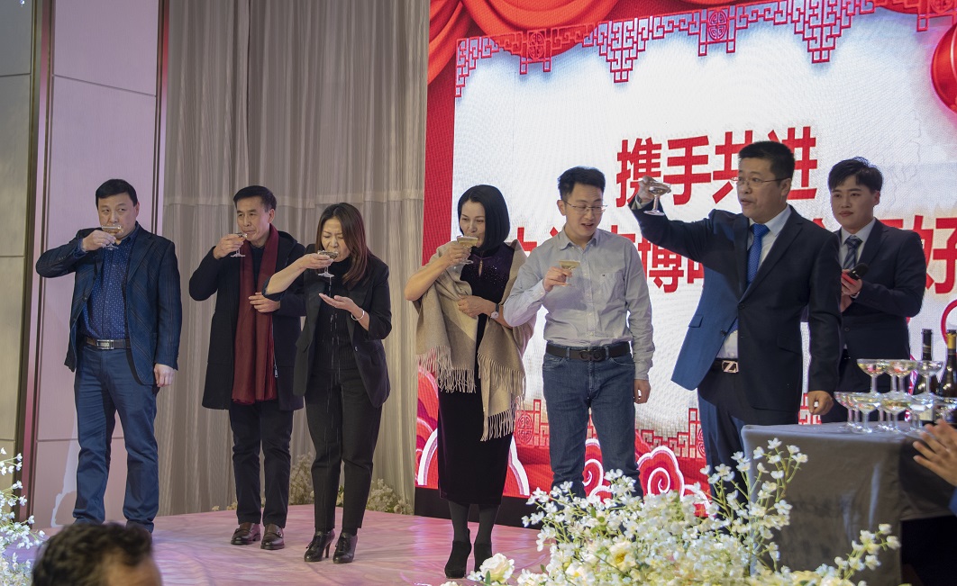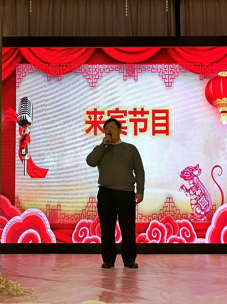 整臺年會的文藝表演有器樂演奏、歌伴舞、詩朗誦、獨唱、獨舞和舞蹈串燒、齊唱、小合唱等多種表演形式,年會的兩位男女主持人是由公司年輕員工小馮、小彭擔任,俊男靚女;文藝節(jié)目的表演者除了公司員工之外,還有家屬和朋友的友情加盟;歌曲《我和我的祖國》演唱完畢,兩位主持人宣布年會開始,首先由董事長張兵老師致辭,張老師在致辭中對各位來賓表示熱烈歡迎,對支持和幫助公司的各界領(lǐng)導和客戶單位以及全體員工、員工家屬表示衷心的感謝,他簡要回顧了公司8年的成長歷程,并展望了美好的未來,最后隨著香檳酒塞的蓬--蓬-開啟,泡沫飛濺、酒香四溢、情誼暖暖,張老師攜同公司管理層祝愿大家闔家幸福,萬事如意,干杯!大家紛紛舉起手中的酒杯一飲而盡,年會出現(xiàn)了第一次高潮。