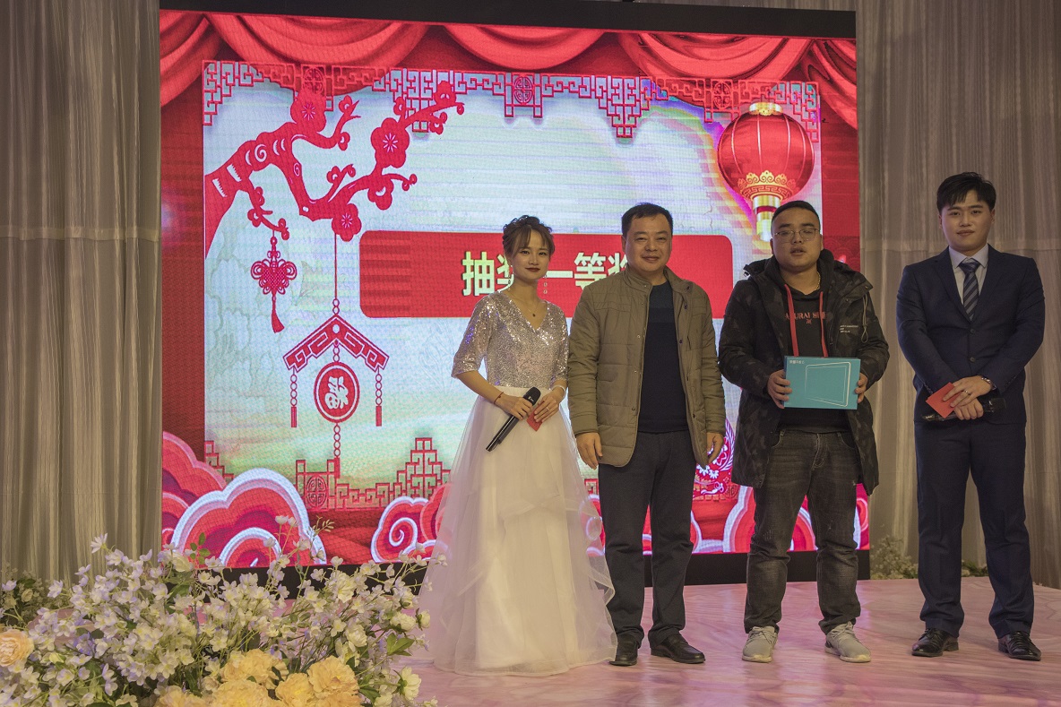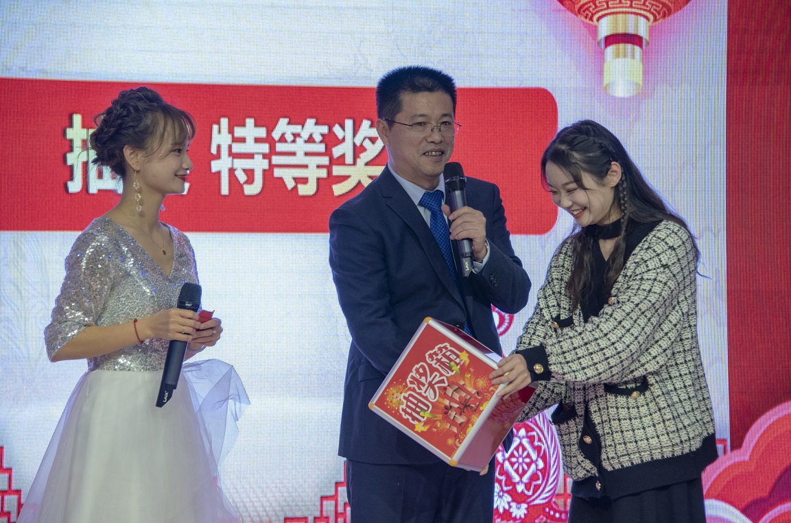 年會還安排了抽獎環(huán)節(jié),設(shè)置了三等獎、二等獎、一等獎、特等獎,獎品有電飯煲、微波爐、小平板和華為手機。今年年會中獎?wù)呒扔泄締T工,更有客戶單位來賓。張老師說中獎面多人廣,覆蓋了企業(yè)單位代表、同行業(yè)單位負責人、公司員工等。這似乎是體現(xiàn)了“成果共享、利益均沾”的效果。張老師抽出的特等獎是一部華為手機,被公司湯會計獲得,這當是“財聚杰博”的興旺之運。