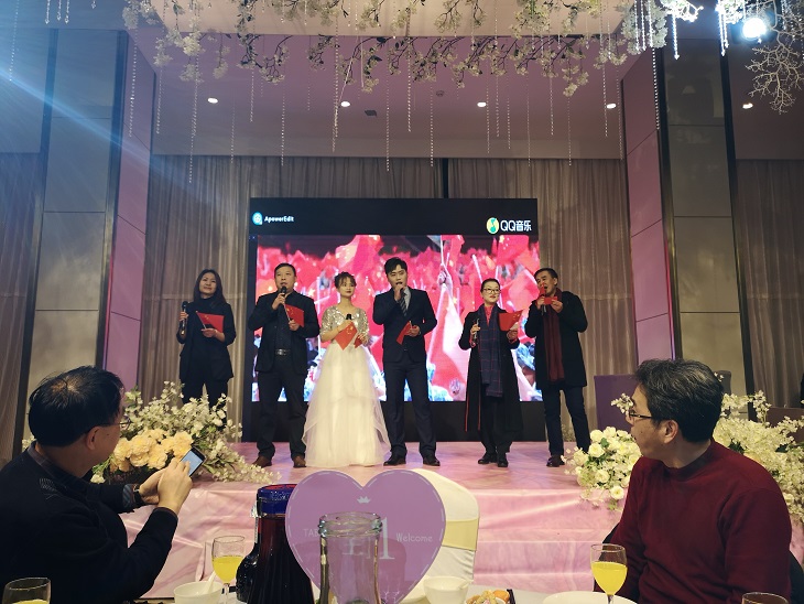 張老師、譚教授的配樂詩朗誦《四月的紀(jì)念》,給人們描繪了一對戀人在浪漫的四月相遇、相識到相知、相戀的心路歷程,男聲深沉渾厚、女聲輕盈委婉,極好地詮釋了詩歌的主題。一闋結(jié)束,張老師用單臂把愛妻擁入懷中,深情地說:今年是他和夫人結(jié)婚30周年的紀(jì)念日,特別感謝妻子30年如一日的愛戀、支持、幫助。這時他們的愛女笑盈盈地走上舞臺,把一大捧紅玫瑰獻(xiàn)給了媽媽。張老師在年會中插入這個溫馨浪漫的環(huán)節(jié),事先沒有告訴譚教授,他是想給譚教授一個驚喜。當(dāng)我們現(xiàn)場看到譚教授接過鮮花時的燦爛笑容時,我深信譚教授是接受了這份愛的驚喜的。人們常說“一個成功男人背后一定有一個偉大的女人”,其實,在九江杰博逐步發(fā)展壯大的道路上,譚教授并不是站在背后的女人,而是始終和丈夫并肩站在一起的人生伴侶、事業(yè)同道!九江杰博能取得今天的成就,應(yīng)是張老師、譚教授風(fēng)雨同舟、攜手共進(jìn)的結(jié)果。大家用掌聲、笑聲、歡呼聲祝福這一對神仙伉儷一輩子恩愛幸福,年會出現(xiàn)了第二次高潮。