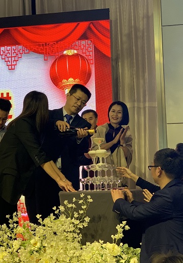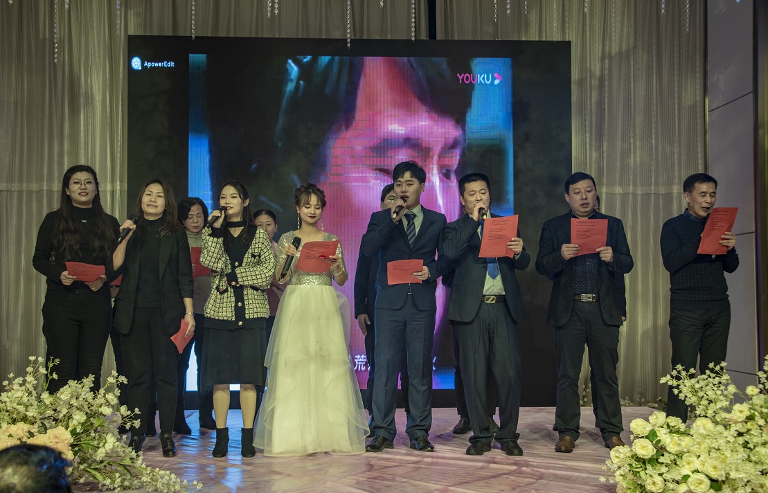 整臺年會的文藝表演有器樂演奏、歌伴舞、詩朗誦、獨唱、獨舞和舞蹈串燒、齊唱、小合唱等多種表演形式,年會的兩位男女主持人是由公司年輕員工小馮、小彭擔(dān)任,俊男靚女;文藝節(jié)目的表演者除了公司員工之外,還有家屬和朋友的友情加盟;歌曲《我和我的祖國》演唱完畢,兩位主持人宣布年會開始,首先由董事長張兵老師致辭,張老師在致辭中對各位來賓表示熱烈歡迎,對支持和幫助公司的各界領(lǐng)導(dǎo)和客戶單位以及全體員工、員工家屬表示衷心的感謝,他簡要回顧了公司8年的成長歷程,并展望了美好的未來,最后隨著香檳酒塞的蓬--蓬-開啟,泡沫飛濺、酒香四溢、情誼暖暖,張老師攜同公司管理層祝愿大家闔家幸福,萬事如意,干杯!大家紛紛舉起手中的酒杯一飲而盡,年會出現(xiàn)了第一次高潮。